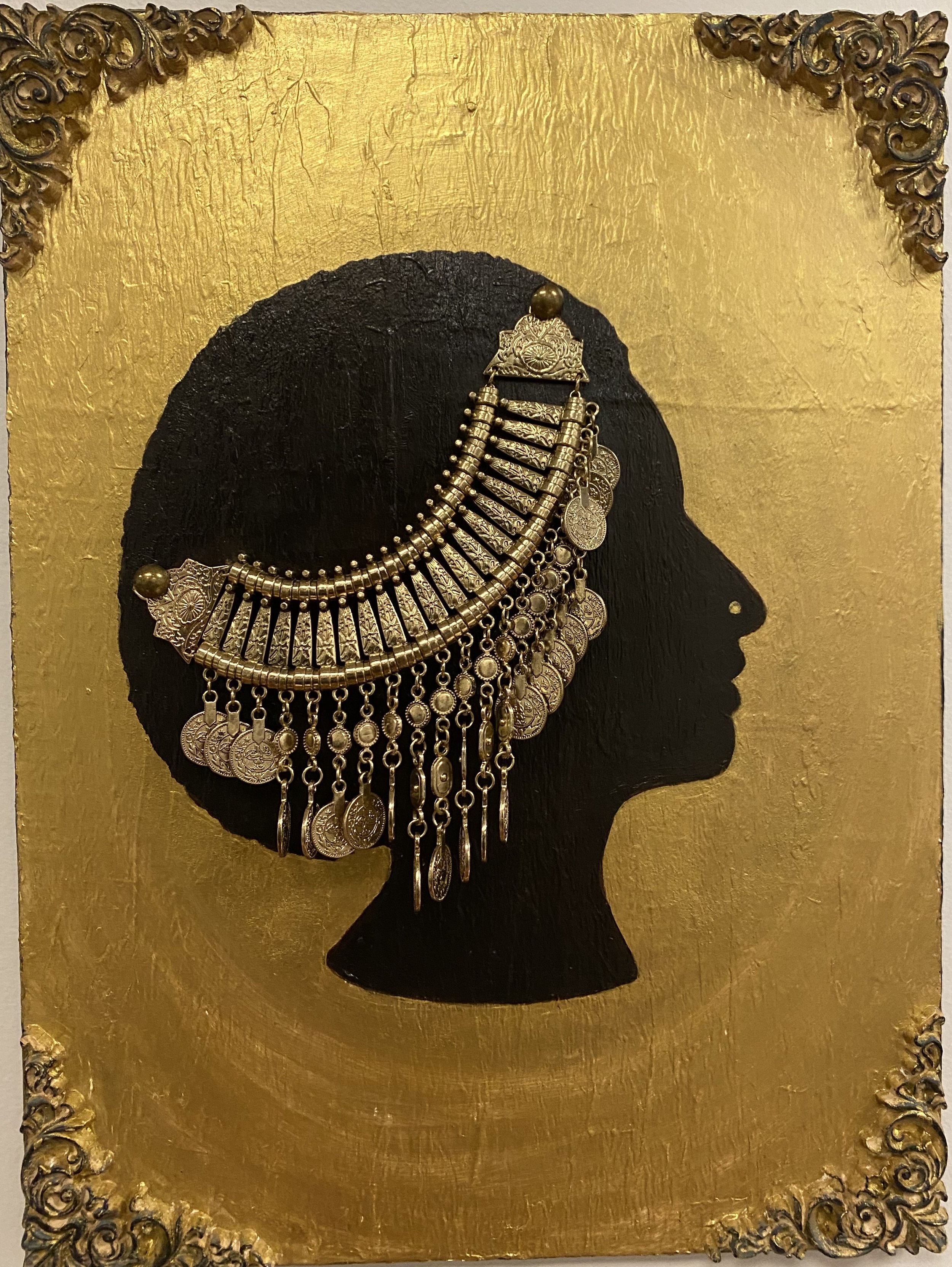 This is an bejeweled profile of a poised Black woman adorned with an affix gold headpiece. Painted with three layers of translucent paper painted with gold metallic paint. The profile several thin layers of oil paint and lastly to give the piece a slightly formal Old World appearance ornamental wooden molds were painted and affixed to the four corners for the perfect touch of elegance.